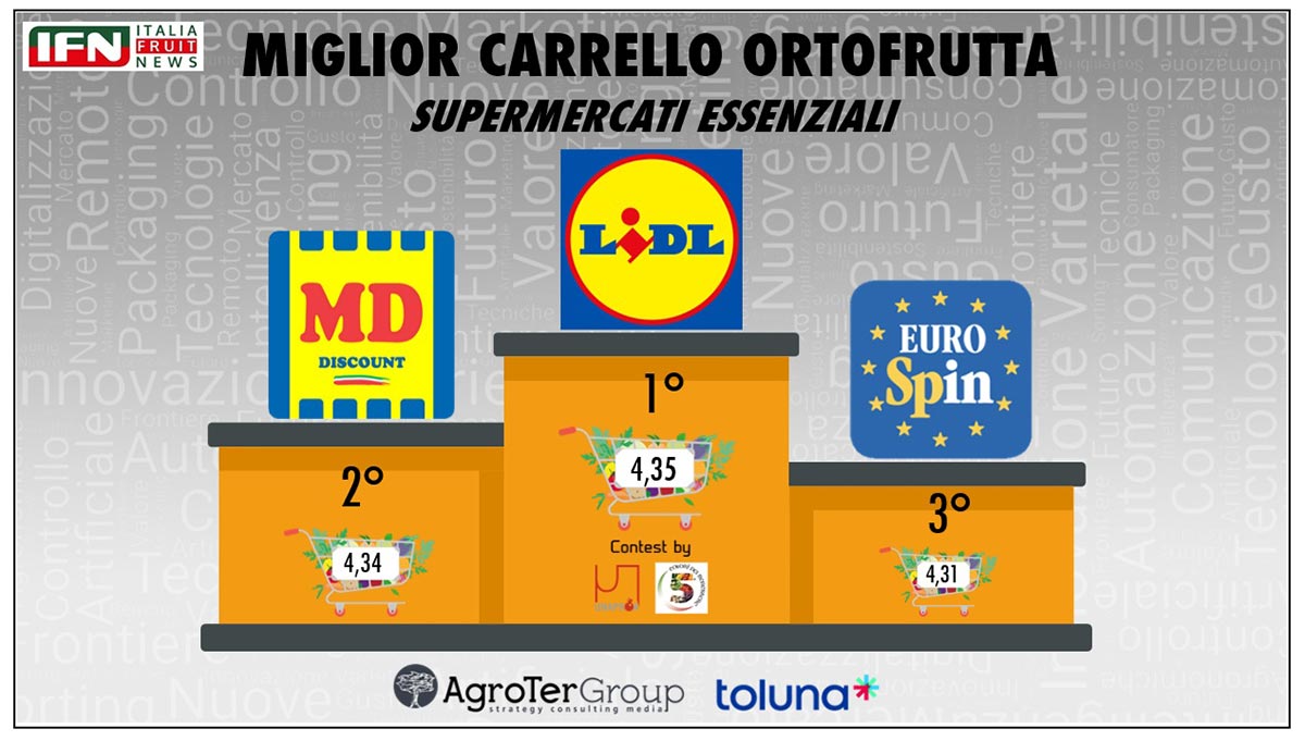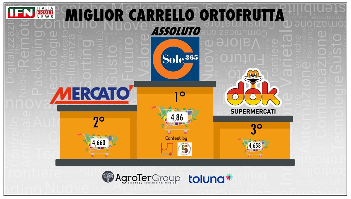 Il premio del miglior carrello assoluto è andato a Sole365 con un punteggio di 4,86 con Mercatò e Dok che occupano rispettivamente la seconda e terza posizione. “Questo riconoscimento è il frutto dell’impegno di una squadra che lavora con tanta passione dove l’ortofrutta non è una categoria merceologica ma bensì la categoria per eccellenza, questo è il nostro segreto”, ha commentato al ritiro del premio Antonio Apuzzo, direttore commerciale di Sole365.