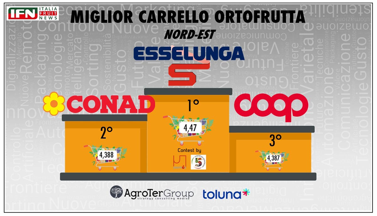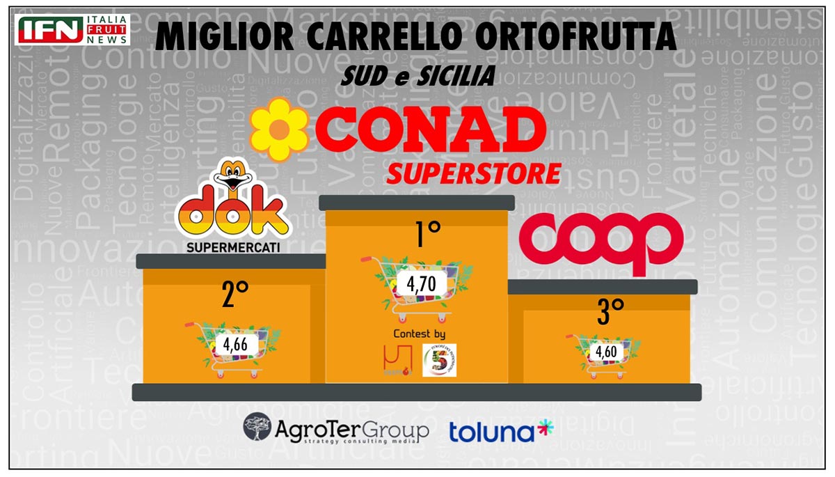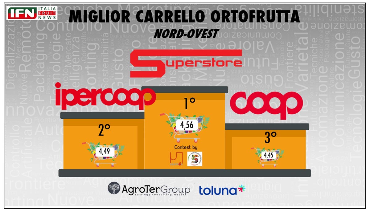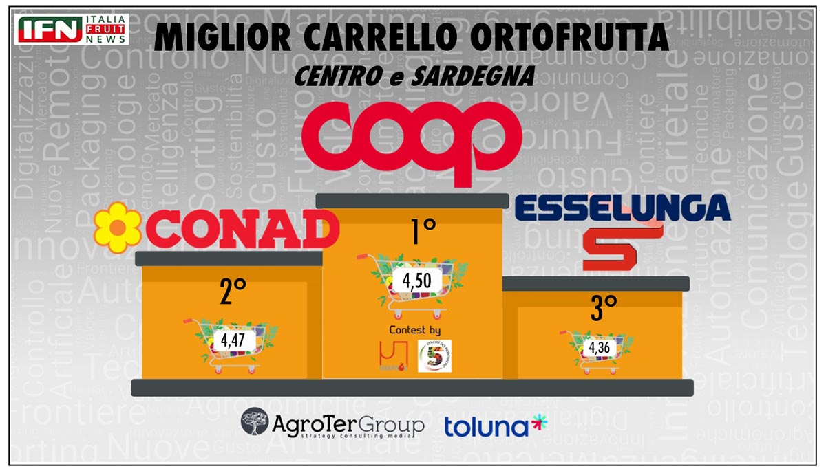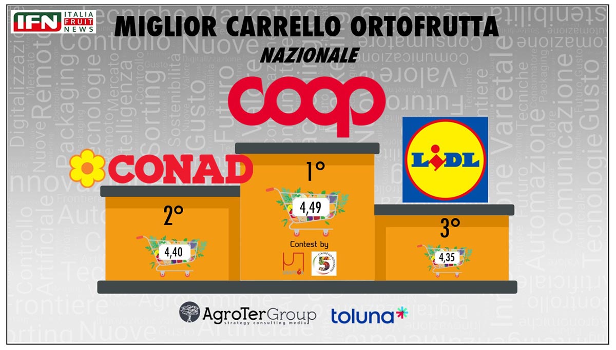 Nella classifica del miglior carrello ortofrutta nazionale a salire sul gradino più alto del podio è Coop con un punteggio di 4,49. Claudio Mazzini, Responsabile settore settore freschissimi Coop Italia, ha evidenziato: “Il premio come miglior reparto nazionale è il riconoscimento di come, anche in un sistema articolato, sia possibile avendo fondamentali forti e politiche comuni condivise, per soddisfare le esigenze di consumatori spesso diverse tra loro. Un ringraziamento a tutte le persone che a punto vendita ogni giorno rendono tutto questo possibile”.