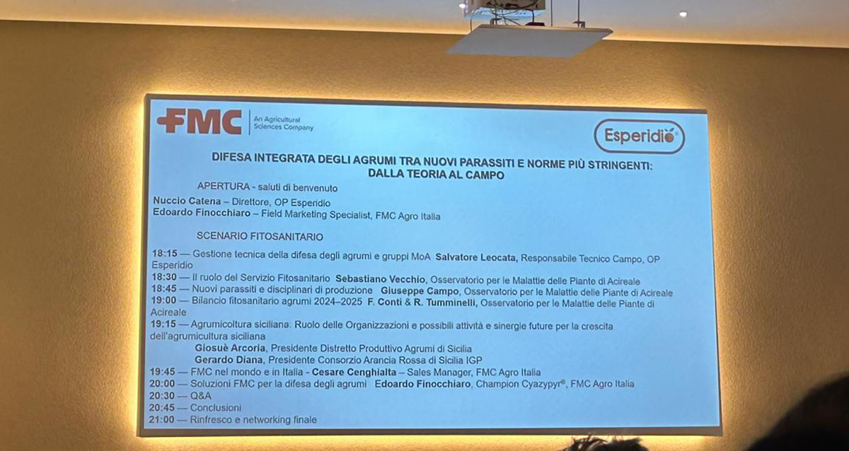 In un contesto segnato da crescente instabilità climatica e nuove pressioni fitosanitarie, l’agrumicoltura siciliana sceglie la strada della compattezza e del confronto tecnico. È questo il messaggio emerso con forza dall’incontro organizzato da OP Esperidio in collaborazione con FMC Agro Italia, andato in scena nei giorni scorsi nella suggestiva cornice della Valle dei Margi. Una partecipazione ampia e trasversale ha caratterizzato l’evento, che ha visto riuniti produttori, agronomi e operatori della filiera in un dialogo intergenerazionale capace di coniugare esperienza e innovazione. Un segnale chiaro di vitalità per un comparto che, pur alle prese con criticità produttive sempre più complesse, dimostra di voler affrontare il cambiamento in modo proattivo.