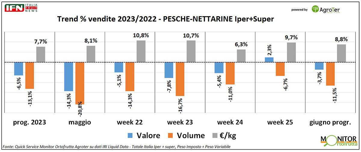 Nell’analisi di dettaglio, ci focalizziamo questa settimana su un’altra categoria della frutta estiva in difficoltà in questo periodo, ma che ha un ruolo chiave nelle vendite del reparto. È il caso di pesche e nettarine che, negli ipermercati e supermercati, mostrano una perdita a volume dell’11,5% nelle prime quattro settimane di giugno, con prezzi medi in crescita dell’8,8%. La flessione dei volumi a mano a mano migliora dalla week 22 alla 25, in cui si attesta al -6,7%, ma ancora non sembra vedersi la luce in fondo al tunnel di questo periodo così complicato a livello di disponibilità di prodotto, qualità e vendite per le categorie di punta. Alcune di queste, in estate, fanno la differenza nel sell out del reparto e vedere dei trend in perdita a doppia cifra come per le pesche-nettarine o, ancora peggio, per le angurie (vedi il caso angurie -30%, clicca qui per approfondire) non è di certo confortante, ma è una ulteriore conferma di come la disponibilità di prodotto influenzi pesantemente ancora una volta i risultati di vendita.
