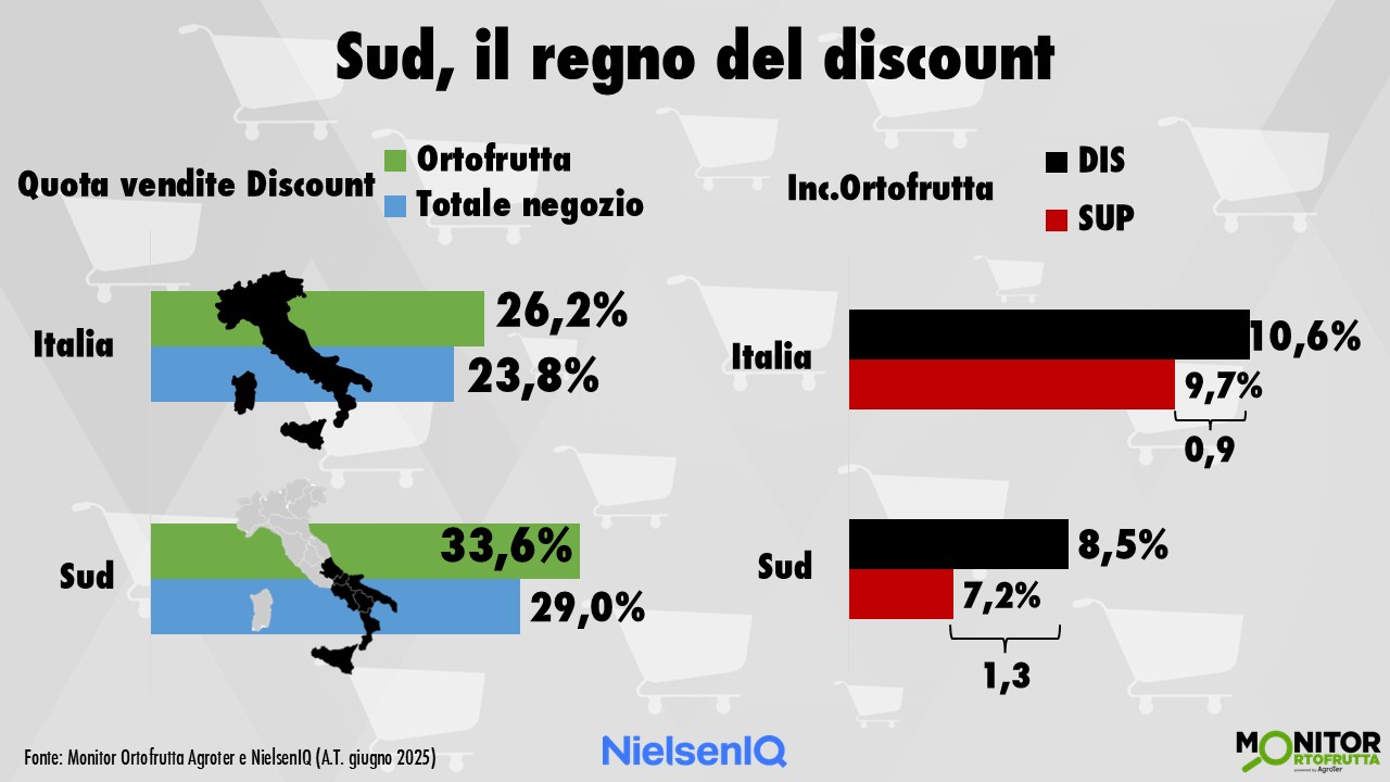 Il canale discount ha trovato terreno fertile in Italia e l’ortofrutta è ormai una delle sue principali leve competitive. Quasi un quarto delle vendite a totale negozio della Gdo passa oggi da questo format (23,8%), quota che sale al 26,2% se si considerano solo i prodotti ortofrutticoli. Nel Sud Italia il divario è ancora più marcato: oltre un terzo delle vendite di frutta e verdura proviene dai discount (33,6%), con un delta di 4,6 punti rispetto alle vendite complessive. Anche l’incidenza dell’ortofrutta sul totale delle vendite conferma questa tendenza. A livello nazionale il discount mostra il dato più alto tra tutti i canali (10,6%), superando di quasi un punto i supermercati (9,7%), dato ancor più eclatante se si considera che la distanza in termini di superficie di vendita si sta riducendo. Nel Mezzogiorno, invece, la Gdo deve ancora confrontarsi con la concorrenza del dettaglio tradizionale, che contribuisce a mantenere più basse le incidenze dell’ortofrutta. In questo contesto, però, il divario tra discount e supermercati si amplia a 1,3 punti.