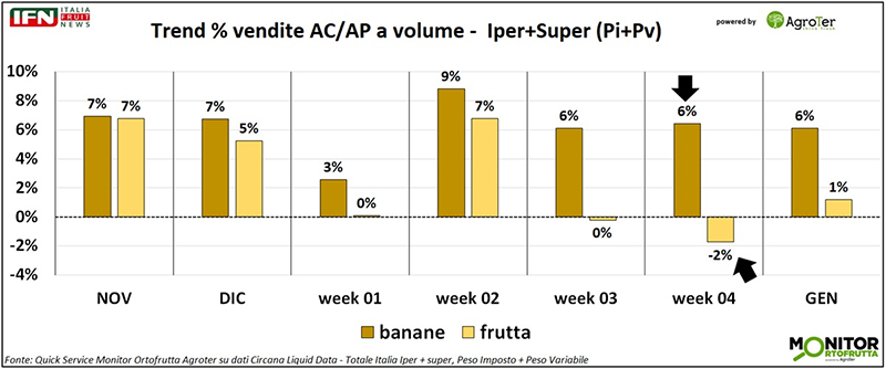 Più in generale, il periodo risulta favorevole anche per i consumi di frutta nel loro complesso, come evidenziato dall’andamento positivo della macrocategoria negli stessi intervalli temporali. Tuttavia, le banane mostrano performance nettamente superiori in termini di volumi nel mese di gennaio (+6% contro il +1% della frutta). Il divario si accentua ulteriormente nelle ultime due settimane del mese: nella week 3 le vendite a volume di banane crescono del 6%, mentre quelle della frutta restano stabili; nell’ultima settimana la frutta entra addirittura in territorio negativo, ampliando il gap fino a 8 punti percentuali.