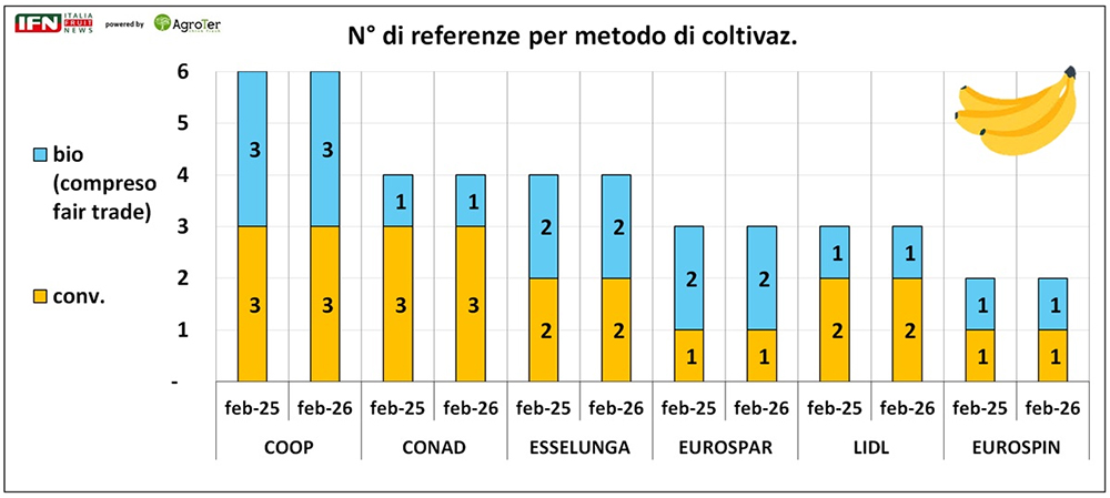 Insegne come Coop, Esselunga ed Eurospin mostrano un equilibrio pressoché perfetto, con una ripartizione 50/50 tra convenzionale e bio. In Conad e Lidl prevale invece la banana convenzionale, mentre Eurospar si distingue per un orientamento più marcato verso il biologico. Anche sotto questo profilo, il quadro rimane invariato rispetto al 2025.