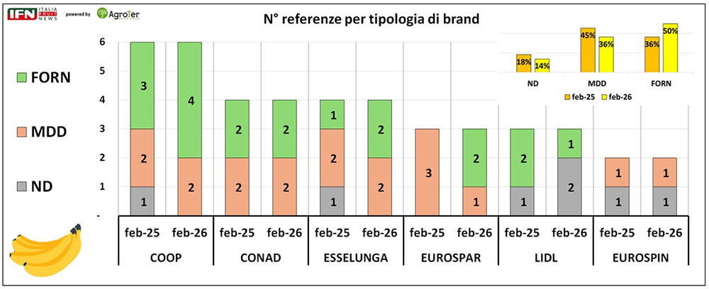 Dal punto di vista dei brand, si rileva l’unica variazione significativa rispetto allo scorso anno: cresce infatti la presenza di prodotto a marchio del fornitore, che arriva a rappresentare la metà delle referenze rilevate (contro il 36% del 2025), a scapito della Mdd e delle referenze prive di brand evidenziato