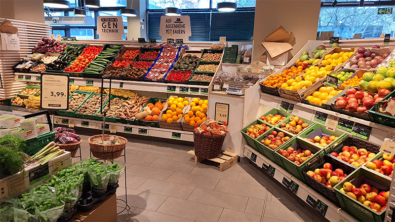Chiude il quadro lo specialista del biologico Bio Company, che restituisce bene la centralità di questa categoria in Germania: uno stile di arredamento del negozio pulito, con materiali caldi come il legno, un reparto ortofrutta ben tenuto, esposizioni attrattive, assortimenti coerenti e una freschezza percepita convincente, elementi tutt’altro che scontati quando l’intero perimetro è bio.