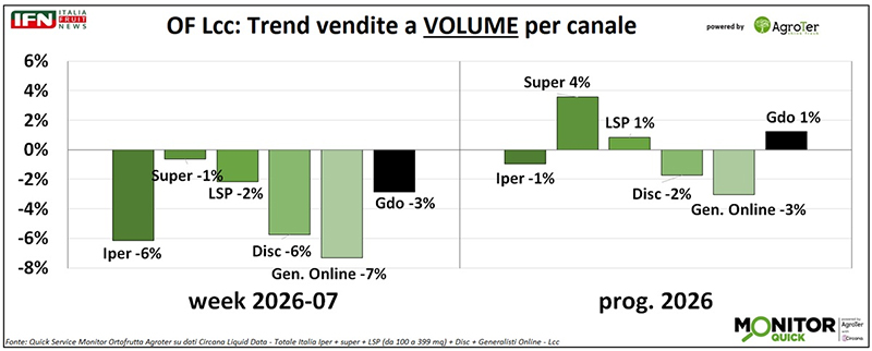 Le vendite a valore dell’ortofrutta Lcc si avvicinano al pareggio nella settimana analizzata, sostenute da un prezzo medio mix in crescita di 3 punti. I volumi, quindi, risultano in flessione per la Gdo nel complesso (-3%). Nessun canale registra una crescita: il supermercato è quello più vicino alla stabilità (-1%), seguito dal libero servizio (-2%), mentre discount e ipermercato mostrano le performance peggiori (-6%), confermando per entrambi un progressivo da inizio anno in calo.