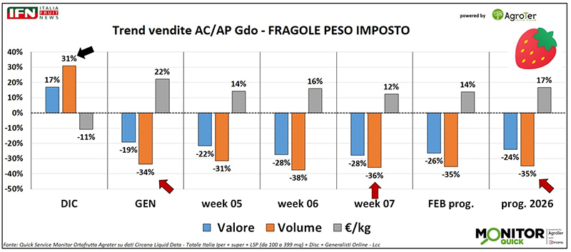 La settimana analizzata comprende San Valentino, periodo in cui le fragole sono ormai un prodotto simbolo della ricorrenza. Tuttavia, le condizioni climatiche avverse di inizio 2026 hanno compromesso la produzione, rallentando la campagna: la disponibilità è risultata inferiore e il trend segna una marcata regressione rispetto al 2025, soprattutto per il prodotto estero.