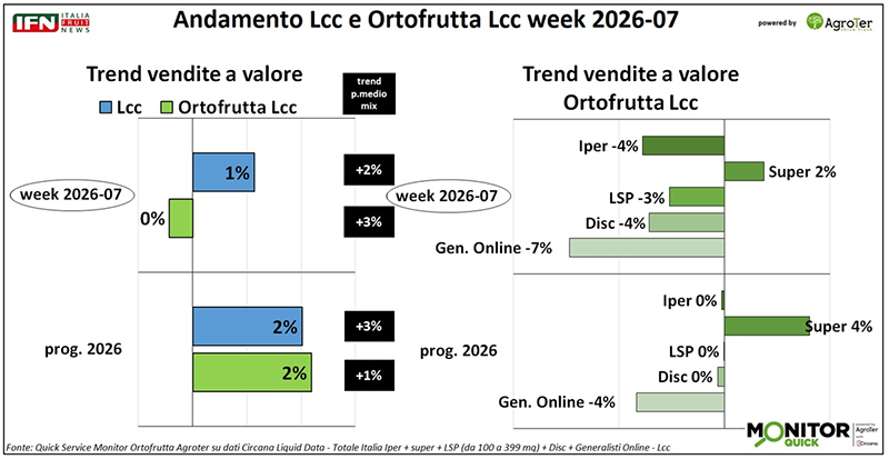 L’ortofrutta a peso imposto non mostra segnali di ripresa nella settimana 7 del 2026: nella Gdo i volumi tornano in calo, dopo una lieve crescita nella settimana 6, mentre il prezzo medio mix continua a crescere. Tra i canali, discount e ipermercati evidenziano le maggiori difficoltà rispetto a supermercati e libero servizio.