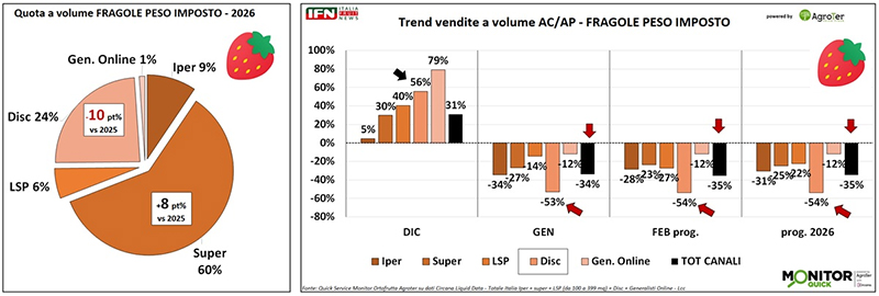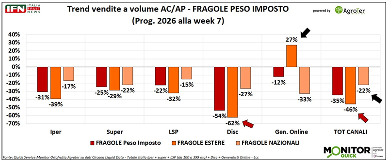 Come accennato, il prodotto estero è quello che ha risentito maggiormente delle difficoltà legate alle condizioni climatiche, e i dati lo confermano: nel progressivo 2026 le fragole registrano un calo del 35%, che si riduce al -22% per il prodotto nazionale ma si amplia fino al -46% per quello estero. I cali più marcati si osservano nel discount, dove le fragole estere arretrano di 62 punti, mentre nel supermercato la flessione si attesta intorno al -29%. Il prodotto italiano, pur rimanendo complessivamente in territorio negativo, mostra un unico segnale positivo nel canale online (+27%), che tuttavia, dato il peso limitato sui volumi, non incide in modo significativo sul risultato complessivo. (lg)