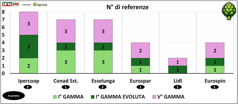 Il numero medio di referenze di carciofo rilevate si attesta sulle 5 per negozio, anche se con differenze sensibili tra i diversi negozi. In generale, i formati più grandi guidano la profondità assortimentale. Ipercoop concentra gran parte della propria offerta sul prodotto servizio di V° gamma e I° gamma evoluta. Una strategia simile è adottata anche da Conad Superstore ed Esselunga, che tuttavia affiancano a questa proposta una maggiore varietà di prodotto basico venduto in mazzo. Dall’altra parte si collocano i discount ed Eurospar che, come di consueto, presentano un assortimento più asciutto: Lidl, con solo 2 referenze punta esclusivamente sul prodotto servizio, mentre Eurospin ed Eurospar presentano tutte e tre le prestazioni con almeno una referenza per ciascuna. Nonostante queste differenze, emerge una strategia comune tra le insegne: la forte presenza del prodotto servizio, con I° gamma evoluta e V° gamma che, nel complesso, rappresentano quasi il 70% delle referenze rilevate.