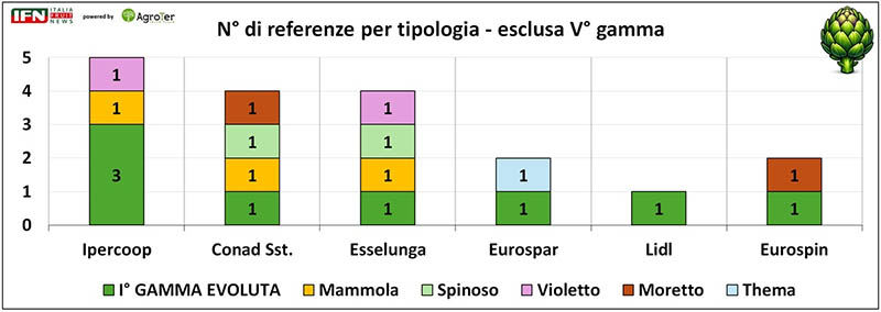 Entrando più nel dettaglio delle tipologie di carciofo, ed escludendo il prodotto servizio di V° gamma, si osserva come la Mammola sia presente su 3 negozi su 6 (Ipercoop, Conad Superstore ed Esselunga). Per le altre tipologie emergono invece strategie differenziate. Conad Superstore ed Esselunga condividono anche la presenza del carciofo Spinoso, ma si distinguono per l’inserimento del Moretto, nel primo, e dello Spinoso nel secondo. Eurospar, diversamente dalle altre insegne, propone nella sua unica referenza di I° gamma il carciofo Thema.