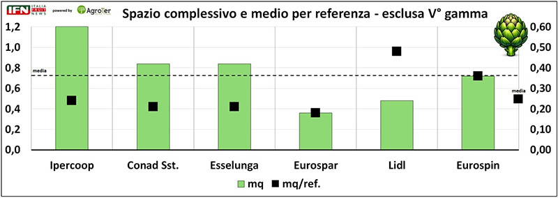 Anche nello spazio dedicato emerge una netta differenza tra i negozi con assortimenti più profondi e quelli più essenziali: i primi, e in particolare Ipercoop, dedicano ai carciofi uno spazio complessivo più ampio. Al contrario le insegne con assortimenti più contenuti – come Eurospar, Lidl ed Eurospin - gestiscono la categoria su superfici complessive più ridotte. Va però sottolineato come i due discount compensino questa scelta con una maggiore superficie espositiva per singola referenza: è il caso di Lidl, che registra il valore di mq per referenza più alto del campione, anche grazie alla presenza del prodotto in promozione posizionato in prima battuta.