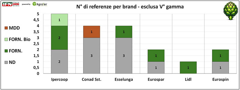 L’analisi delle marche, ad esclusione del prodotto di V° gamma, evidenzia come più della metà delle referenze rilevate non presentino alcun brand specifico, soprattutto fra i prodotti I° gamma, venduti confezionati a mazzi. Rimane comunque significativa la presenza dei marchi dei fornitori, che rappresentano circa il 33% delle referenze rilevate. Da segnalare anche una referenza biologica in Ipercoop, relativa al prodotto servizio di I° gamma evoluta. Diverso il tema sulla Marca del Distributore: solamente Conad Superstore propone una referenza a proprio marchio.
