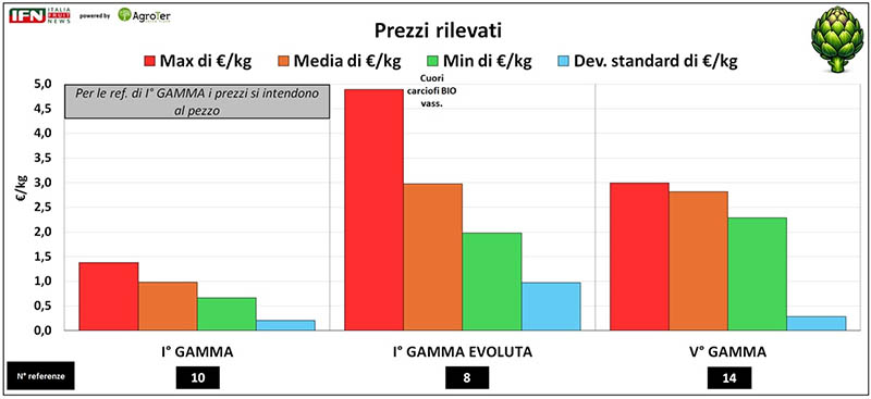 Nella I° gamma, dove il prodotto è venduto a capolino o in mazzi, i prezzi sono da considerarsi al pezzo e si attestano mediamente sotto l’euro, con un valore di 0,98 € e una variabilità piuttosto contenuta tra le diverse referenze. Passando al prodotto servizio di I° gamma evoluta, il prezzo medio rilevato è pari a 2,97 €/kg, con un picco massimo di 4,89 per una referenza di cuori di carciofo biologici. Infine, nella V° gamma, trattandosi di prodotto industriale, i prezzi risultano più omogenei tra le insegne, con un euro-chilo medio che si attesta intorno a 2,82. (lg)