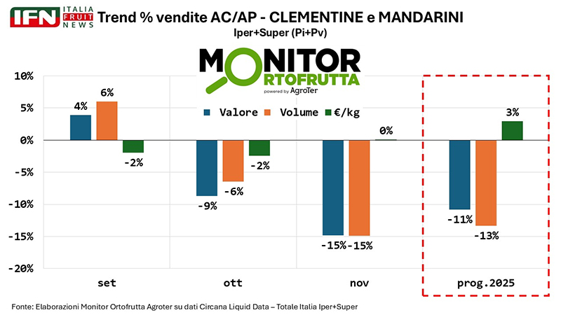 La campagna delle clementine e dei mandarini procede tra luci e ombre. Dopo un avvio segnato da calibri contenuti, la qualità è progressivamente migliorata, riportando il prodotto su standard adeguati sia in termini di pezzatura sia di caratteristiche organolettiche. I volumi risultano però in calo del 15-20%, un dato che riflette l’impatto ormai strutturale del cambiamento climatico. Sul fronte commerciale, novembre ha mostrato un rallentamento della domanda, soprattutto nella Gdo, mentre il discount continua a crescere. L’export sostiene le realtà più organizzate, ma la filiera italiana resta penalizzata da una forte frammentazione produttiva e commerciale.