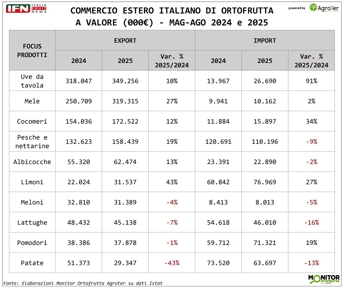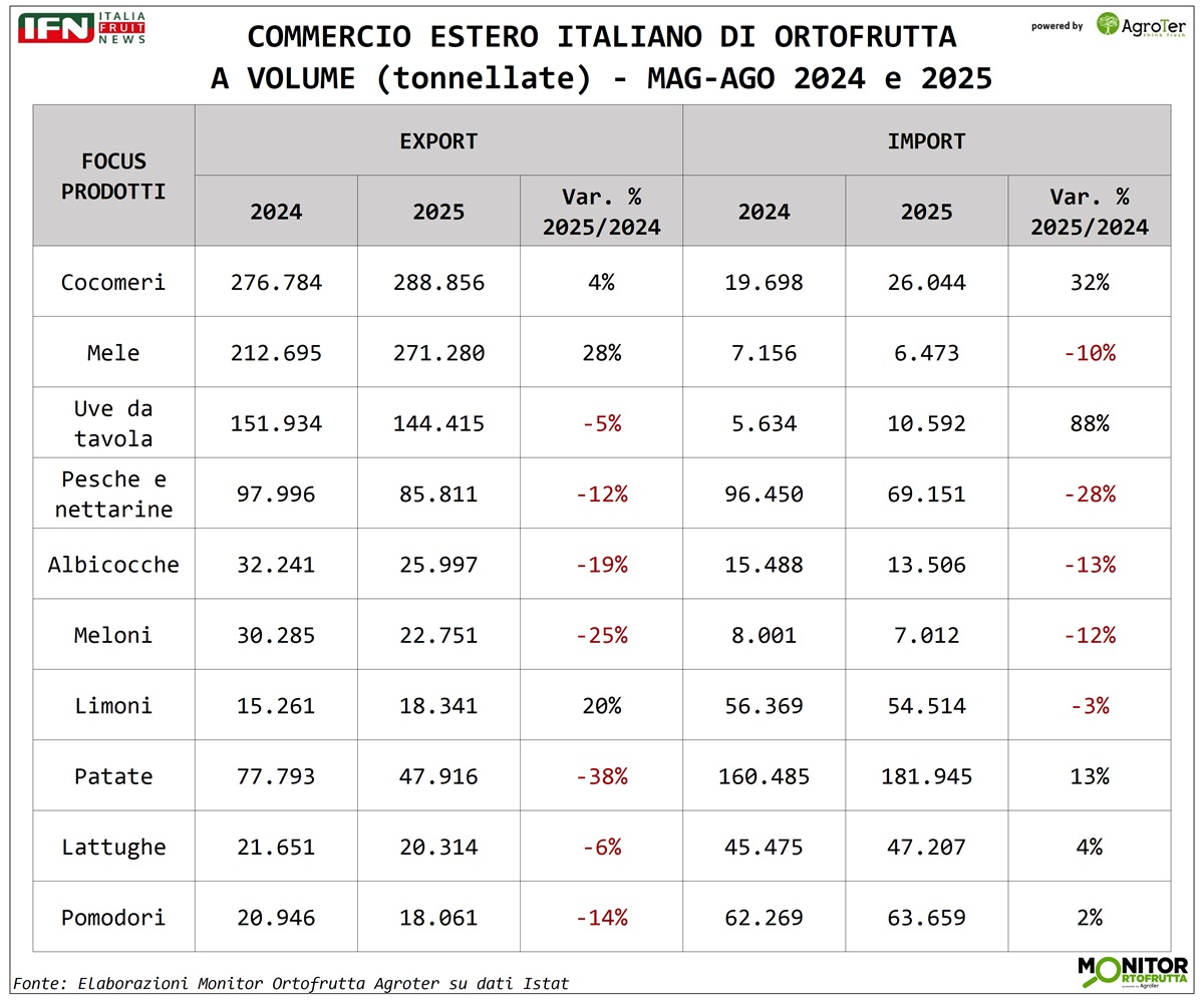 Nei primi otto mesi del 2025 l’Italia esporta 2,58milioni di tonnellate di ortofrutta, pari a un +4% sullo stesso periodo dell’anno precedente, mentre il valore sale a 4,18 miliardi, con un incremento del 13%. La crescita risulta trasversale ma più intensa per alcuni comparti.