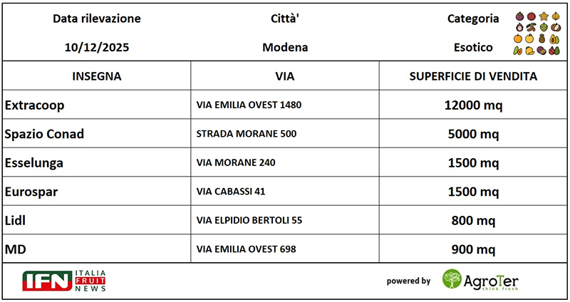 La frutta esotica, insieme ai frutti di bosco, si conferma la categoria rivelazione del 2025. La crescita appare inarrestabile, con un significativo +36% a volume nei primi undici mesi dell’anno nella Gdo (clicca qui per approfondire). Alla luce di questi risultati, abbiamo completato l’analisi con una rilevazione su assortimenti, spazi espositivi, confezioni, brand e prezzi, realizzata da IFN - Italiafruit News su un campione di sei punti vendita dell’area di Modena all’inizio di dicembre.