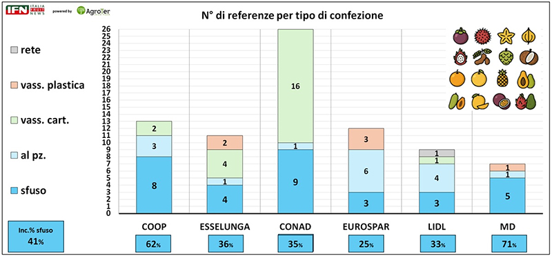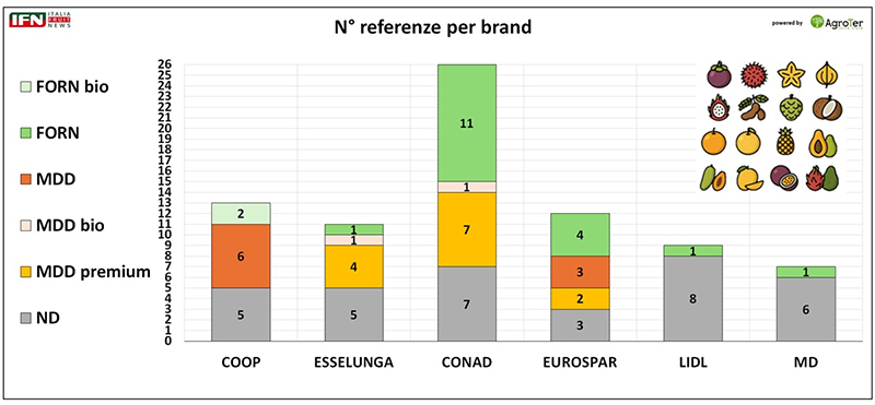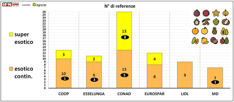 Il divario tra Conad e le altre insegne è contenuto per i frutti esotici a presenza più continuativa sui banchi (ananas, avocado, cocco, mango, papaya), mentre diventa marcato nel comparto del cosiddetto “super esotico”, che comprende prodotti generalmente offerti soprattutto in prossimità delle festività natalizie. In questo segmento Conad arriva a 13 referenze, contro le 2–4 degli altri supermercati, mentre nei discount questo segmento non pare ancora presidiato.