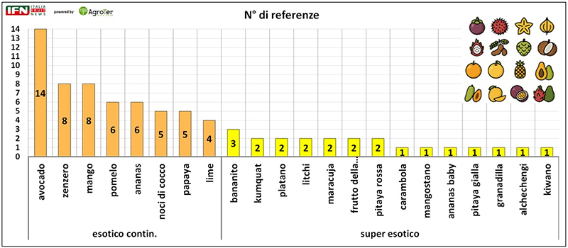 Con il termine “frutta esotica” abbiamo incluso tutti i prodotti che rispondono al significato letterale della definizione, ovvero provenienti da Paesi lontani. La categoria comprende quindi sia la frutta tropicale sia altri articoli, come pomelo e zenzero (non sempre provenienti da Paesi tropicali); questo accorpamento segue anche la modalità espositiva adottata nei punti vendita.