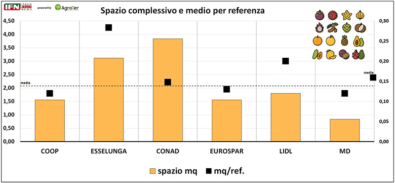Nel complesso, va comunque evidenziato come lo spazio medio per referenza destinato alla frutta esotica resti contenuto rispetto alla maggior parte delle categorie analizzate negli ultimi mesi. Una scelta dettata dall’incertezza nella rotazione di alcuni prodotti, che induce i responsabili di reparto a limitare quantità e superfici espositive per contenere gli sfridi, garantendo al contempo una collocazione privilegiata all’interno del reparto.