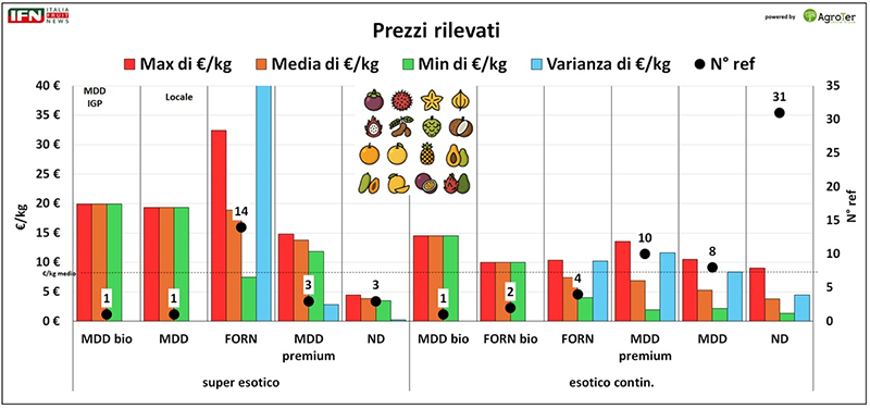 Il super esotico a marchio del fornitore è il segmento con la maggiore variabilità di prezzo: su 14 rilevazioni, la media si colloca intorno ai 20 €/kg. Per l’esotico continuativo, invece, i valori scendono in modo significativo, attestandosi sotto i 5 €/kg.