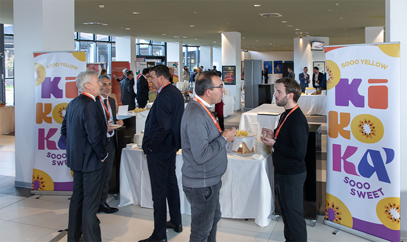 L’accoglienza è iniziata alle 9.30 con un welcome coffee curato da Kikokà. L’azienda ha proposto i suoi kiwi gialli in purezza, accompagnati da biscotti, succhi e bevande calde, creando un’atmosfera informale ideale per i primi scambi tra i partecipanti, in attesa del convegno dedicato alla presentazione della prima edizione dell’Atlante della Distribuzione italiana di Frutta & Verdura.