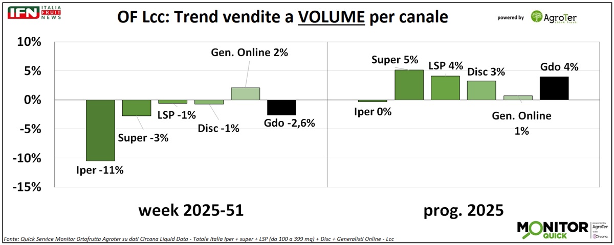 Nella penultima settimana dell’anno, le vendite a valore di ortofrutta Lcc registrano una flessione del 3,5%, accompagnata da un calo del prezzo medio mix di poco inferiore a un punto. Di conseguenza, anche i volumi risultano negativi per il totale Gdo (-2,6%). Il segno meno interessa tutti i canali fisici, mentre l’online rappresenta l’unica eccezione, con una crescita seppur contenuta (+2%).