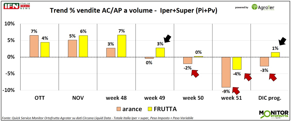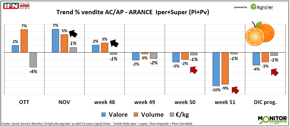 Rispetto all’andamento complessivo della frutta, nei mesi di ottobre e novembre le arance registrano trend positivi, in linea con la macrocategoria di riferimento. A partire dalla settimana 49, tuttavia, si osserva un progressivo peggioramento che porta le arance in territorio negativo nelle settimane 50 e 51, con performance peggiori rispetto a quelle della frutta nel suo complesso con il risultato complessivo di un progressivo a dicembre con segni discordanti come performance tra arance e frutta. (aa)