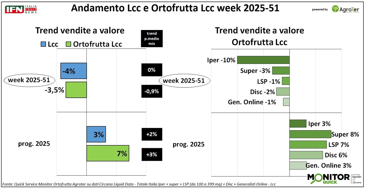 La settimana 51, la penultima dell’anno che si è conclusa domenica 21 dicembre, registra un andamento negativo delle vendite di ortofrutta Lcc, accompagnato da una lieve flessione del prezzo medio mix. Il calo interessa tutti i canali fisici, con performance particolarmente deboli per supermercati e ipermercati, mentre l’online rappresenta l’unica eccezione, con un trend in crescita. Tra le categorie stagionali, le arance si avviano nel mese di dicembre con difficoltà, dopo i risultati positivi registrati a ottobre e novembre.