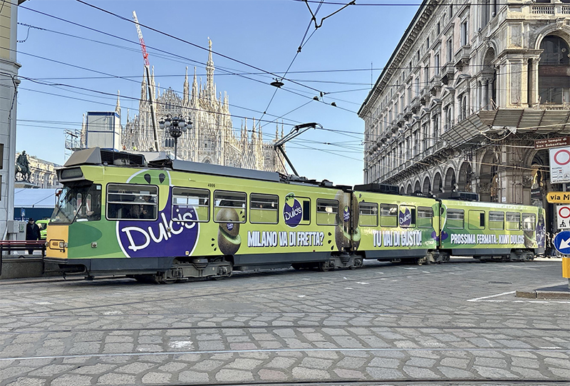 Ottimo riscontro anche per la campagna milanese di dicembre, che ci ha visto protagonisti sui tram di Milano: i mezzi sono diventati parte del racconto del brand con un approccio nuovo e originale, colorando i classici tram a tre casse con il messaggio: “Milano va di fretta? Tu vai di gusto! Prossima fermata: Kiwi Dulcis™”.