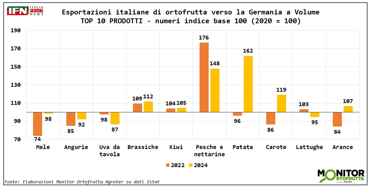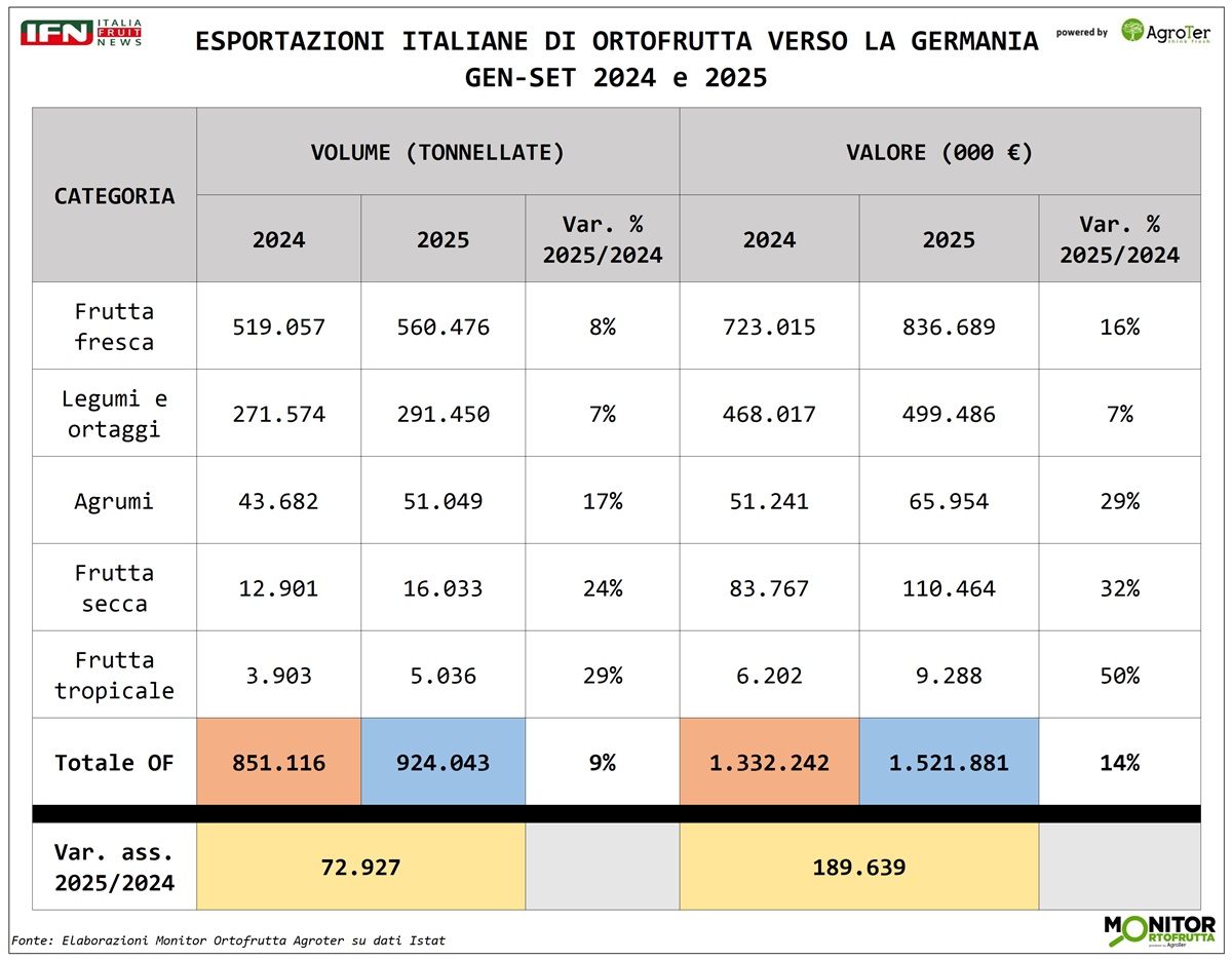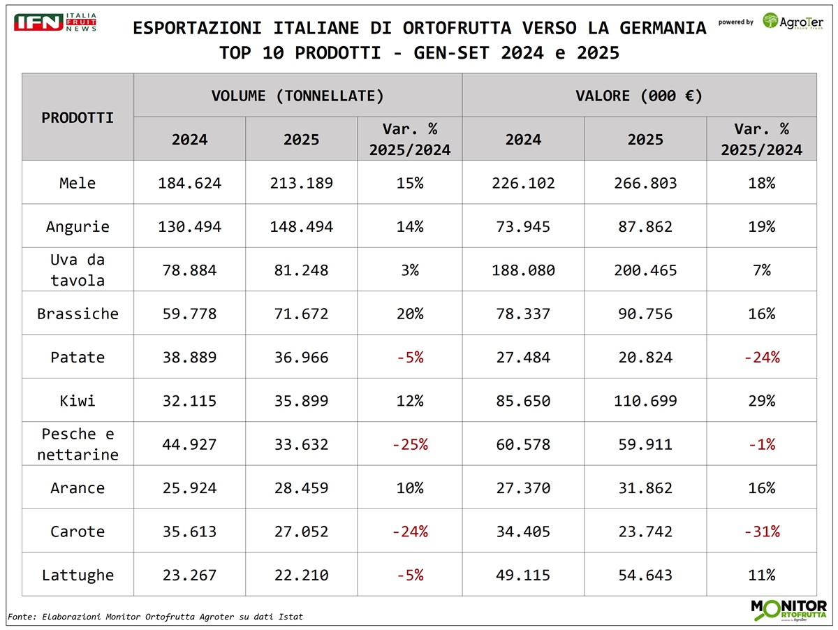 Nelle analisi degli scambi con l’estero dell’ortofrutta italiana, una delle certezze resta la Germania, storicamente primo mercato di destinazione oltreconfine. Un primato che merita di essere approfondito alla luce dei dati del Monitor Ortofrutta di Agroter, utili a comprendere l’evoluzione di un rapporto strategico che, in sintesi, appare ancora solido. Tra il 2020 e il 2024, infatti, le esportazioni verso il mercato tedesco sono cresciute del 20% a valore, raggiungendo 1,8 miliardi di euro, mentre i volumi sono rimasti sostanzialmente stabili (+1%) a quota 1,1 milioni di tonnellate. Nei primi nove mesi del 2025 si registra già un ulteriore incremento del 14% del fatturato e del 9% dei volumi. Se il trend fosse confermato, per la prima volta la Germania potrebbe superare la soglia dei 2 miliardi di euro di acquisti di ortofrutta italiana.
