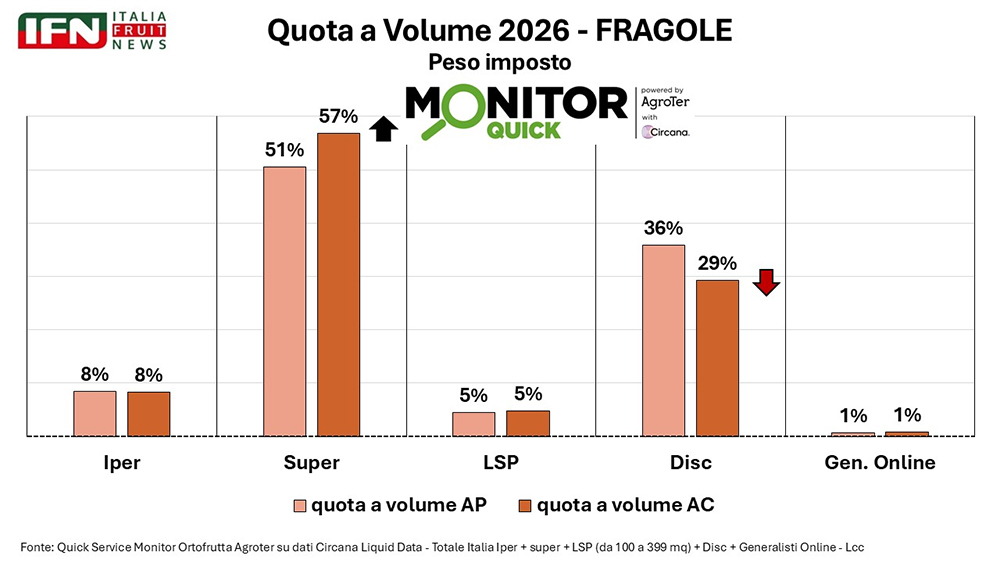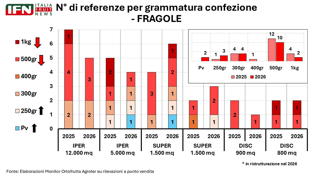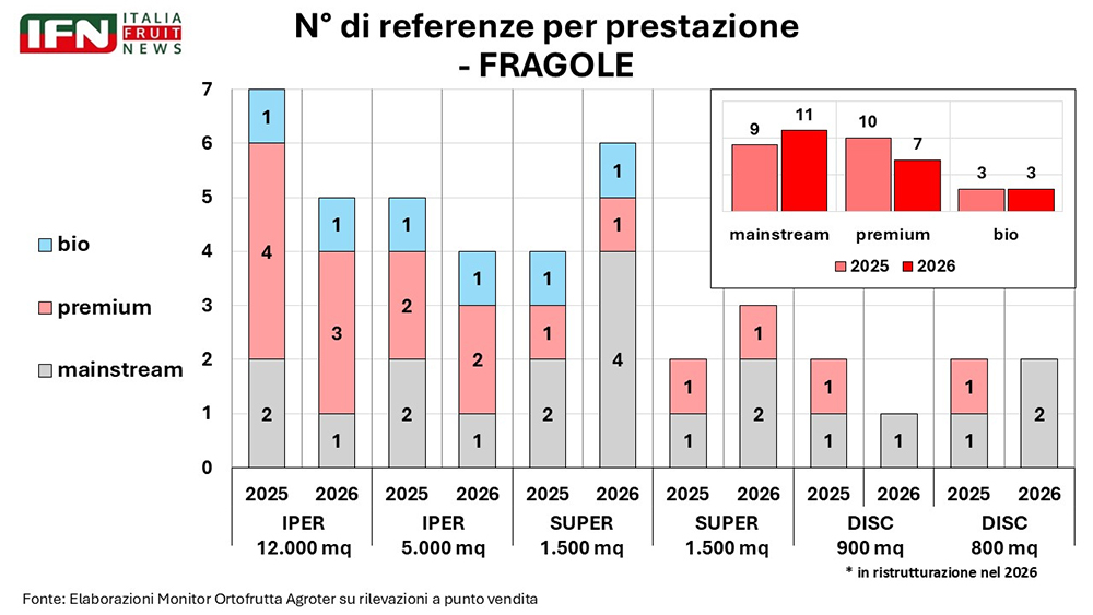 Sul fronte distributivo, Roberto Della Casa, direttore di IFN, evidenzia una segmentazione sempre più marcata della categoria. “Dai numeri si nota che c’è stata una forte segmentazione nel mercato. Abbiamo ipermercati e supermercati con presenza di prodotti biologici e premium, mentre i discount hanno visto una riduzione e in alcuni casi addirittura un’assenza di referenze non solo biologiche ma anche di alto di gamma”. Una dinamica che, nel caso delle fragole, ha prodotto un effetto in controtendenza rispetto ad altre categorie ortofrutticole: “Negli ultimi anni quasi ovunque in ortofrutta avevamo visto discount che guadagnavano quote; nel caso delle fragole, invece, nel 2025 i discount hanno perso competitività”.