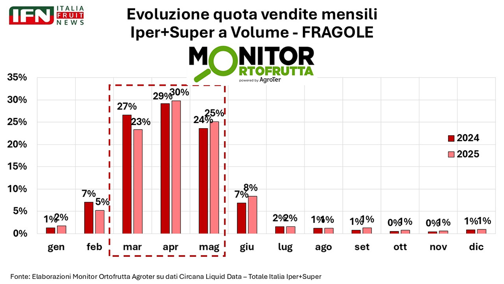 La chiave sta anche nel modo in cui la categoria viene presentata a scaffale. Commentando le slide mostrate durante la diretta, Della Casa ha sottolineato “il tentativo abbastanza evidente, soprattutto negli ultimi anni, di ridurre le confezioni convenienza, quelle grandi, a vantaggio delle confezioni piccole”, segnale di una fragola sempre più acquistata come prodotto premium e meno come referenza da volume. Non solo: in alcuni casi si assiste anche al ritorno del peso variabile, una soluzione che sembrava ormai superata. A questo si aggiunge una stagionalità molto concentrata: quasi l’80% dei volumi si sviluppa in tre mesi, con febbraio e giugno a fare da mesi accessori e una presenza molto più limitata nel resto dell’anno.