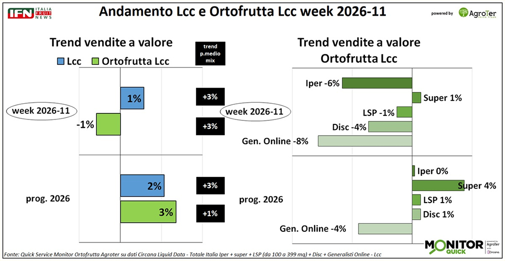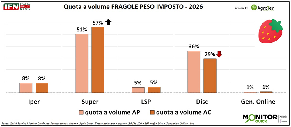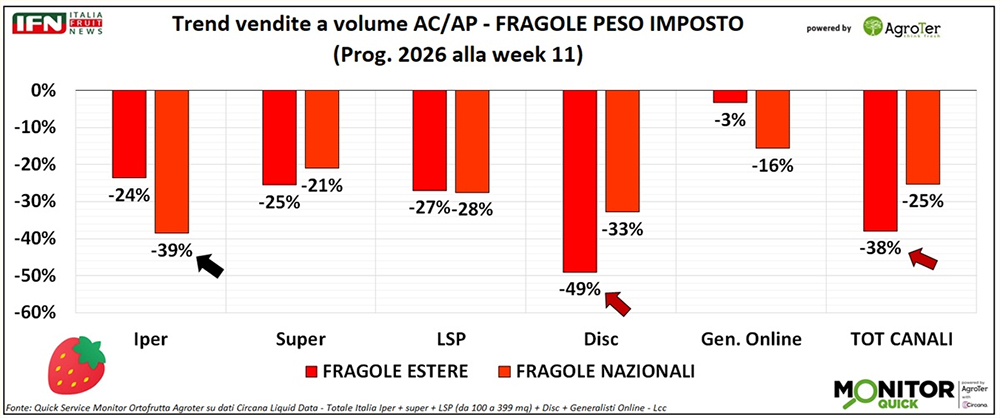 Le difficoltà produttive hanno interessato l’Italia, ma in misura almeno uguale la Spagna, e i trend di vendita per origine confermano questo scenario. Nel progressivo alla settimana 11, le fragole nazionali — che nel 2025 rappresentavano il 60% dei volumi — registrano un calo del 25%, mentre quelle estere, pari al restante 40%, arretrano del 38%. La flessione del prodotto spagnolo risulta ancora più accentuata nel canale discount, dove tocca il -49%, contro il -33% del prodotto nazionale. Un dato che riflette il tradizionale maggiore ricorso di questo canale all’origine spagnola, soprattutto nelle fasi iniziali della campagna, e che in un contesto così difficile ha finito per amplificare l’impatto sulle dinamiche di vendita. (lg)