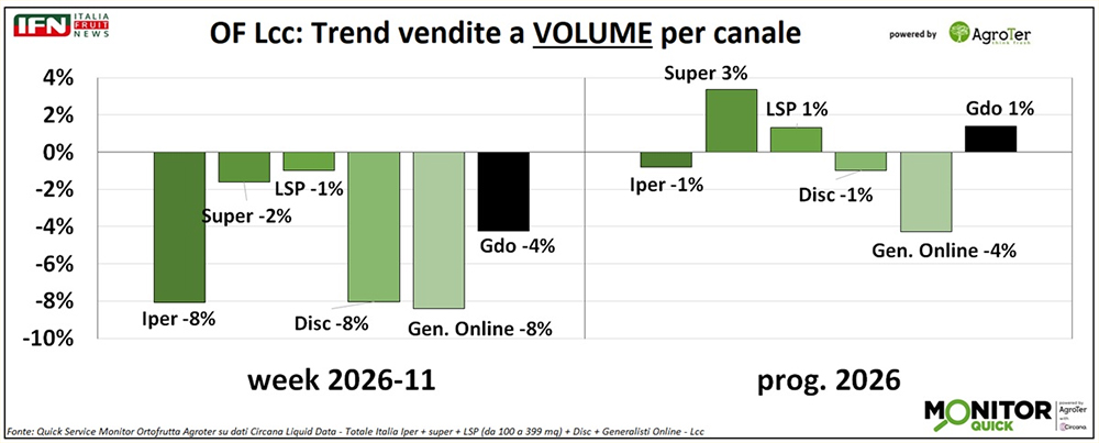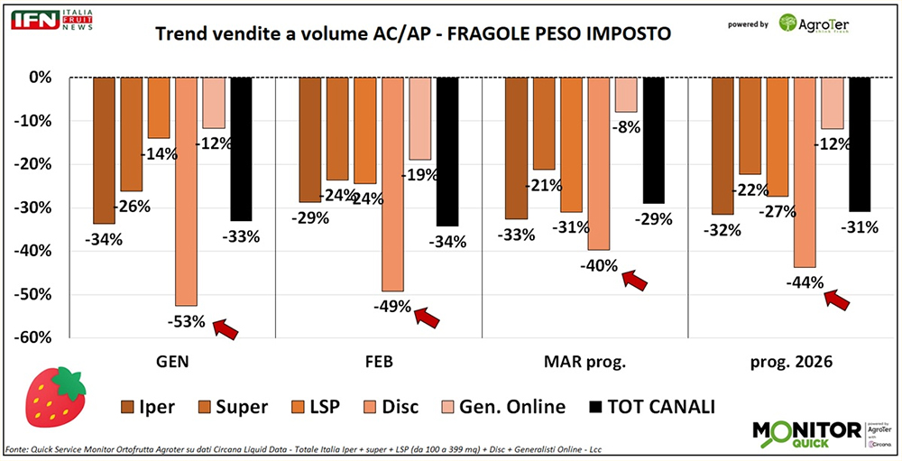 A incidere su questa fase poco favorevole sono certamente anche le fragole, che a marzo normalmente registrano un vero e proprio salto delle vendite rispetto ai primi mesi dell’anno. Nel 2026, però, il confronto con un 2025 positivo si presenta decisamente in rosso: da inizio anno il calo è del 31% a volume, con tutti i mesi allineati su questo andamento, marzo compreso (-29%).