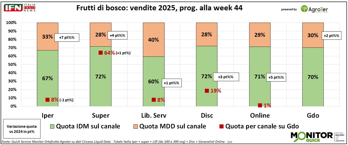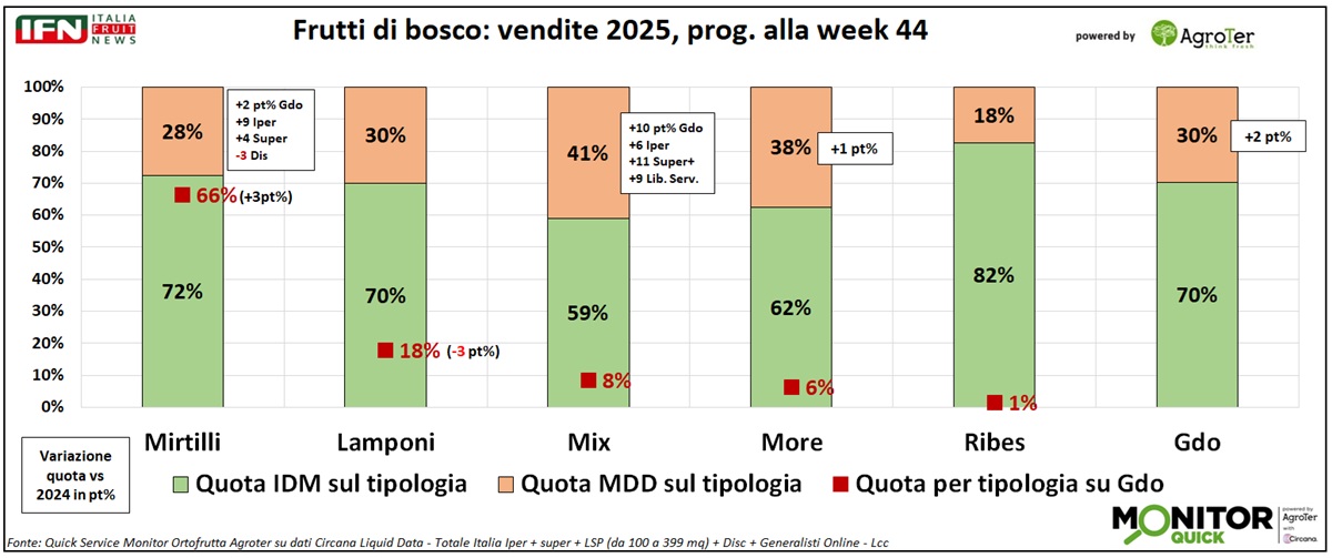 Molto eterogeneo anche il rapporto tra MDD e IDM a seconda della specie. Nel mirtillo l’MDD pesa il 28%, in crescita di 2 punti grazie soprattutto agli incrementi registrati negli iper (+9%) e nei supermercati (+4%), mentre i discount arretrano (-3%). Per lamponi, more e ribes le differenze sono più contenute. Spicca invece la vivacità del segmento mix, dove l’MDD raggiunge il 41% e con una crescita a doppia cifra (+10 punti) e i supermercati in prima linea (+11 punti). Una referenza innovativa sulla quale le catene stanno evidentemente investendo per aumentare la penetrazione e valorizzare la categoria attraverso il proprio marchio.