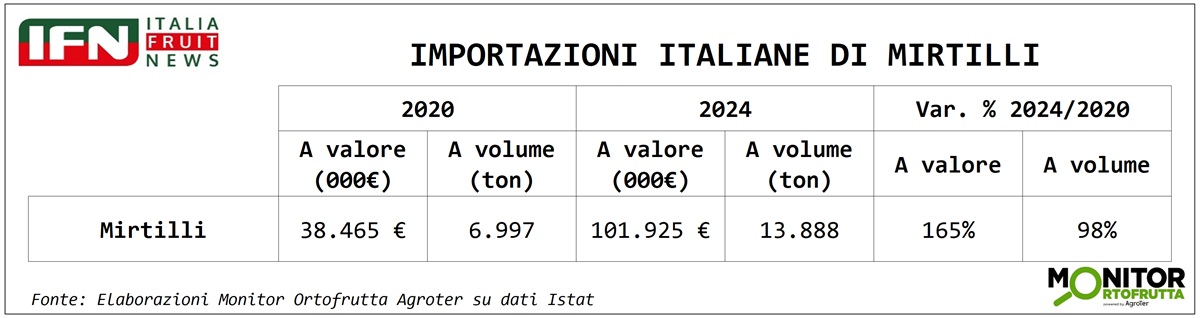 La chiusura non può che essere dedicata al mirtillo, protagonista incontrastato della categoria. La crescita esplosiva dei consumi poggia soprattutto sulle importazioni, come mostra l’analisi del periodo 2020-2024: il valore dell’import è passato da 38 milioni a oltre 100, segnando un +165% a fronte di un incremento dei volumi del 98%. Un ritmo che non trova riscontro nella produzione nazionale ferma a circa 1.500 ettari e 8-10 mila tonnellate annue, mentre la Spagna coltiva quasi 5 mila ettari e produce tra 60 e 70 mila tonnellate all’anno. Una distanza che fotografa chiaramente quanto il potenziale del comparto italiano resti ancora in larga parte da sviluppare.
