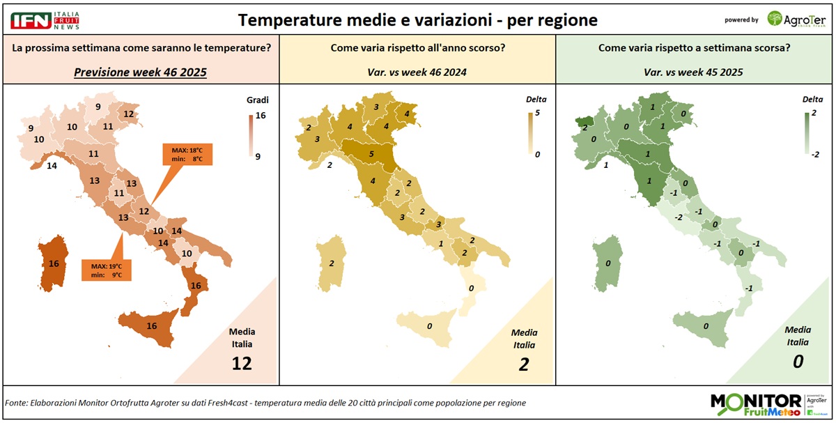 Le analisi del Monitor Ortofrutta si arricchiscono grazie a una nuova collaborazione dedicata a esplorare settimanalmente una variabile spesso decisiva per il settore ortofrutticolo: il meteo. Tra i diversi fattori che influenzano le condizioni climatiche, questa nuova rubrica si concentra in particolare sulle temperature medie registrate lungo la Penisola, con il supporto di Fresh4cast, una piattaforma software in cloud specializzata nella previsione della domanda e nell'ottimizzazione della supply chain per il settore ortofrutticolo.