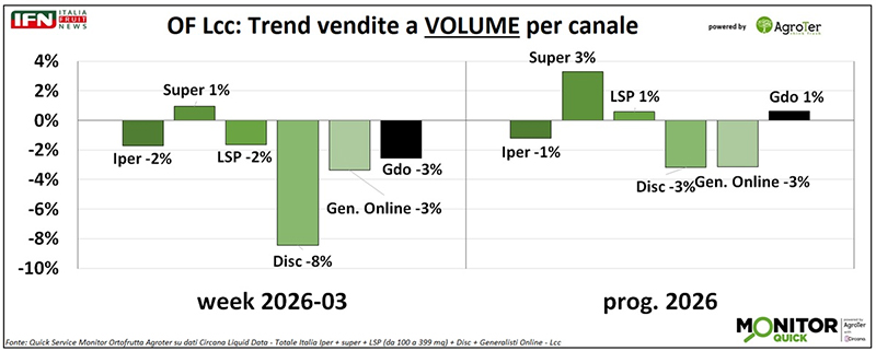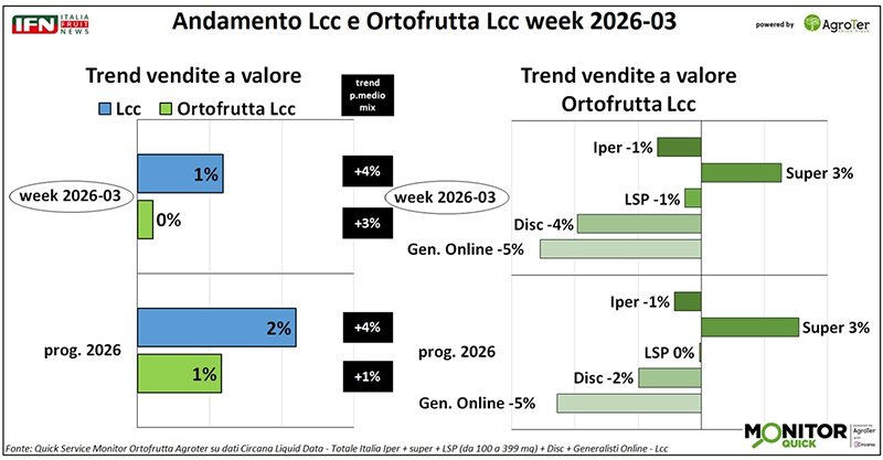 Nella terza settimana del 2026 le vendite di ortofrutta Lcc segnano una battuta d’arresto rispetto all’ottima performance della settimana precedente. L’incasso risulta stabile, sostenuto esclusivamente dall’aumento del prezzo medio mix, mentre i volumi sono in calo nella maggior parte dei canali, con una flessione particolarmente marcata nel discount.