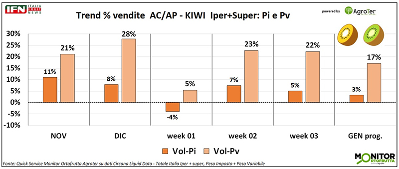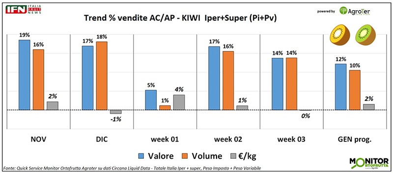 In generale, il periodo è favorevole anche per i consumi di frutta, come emerge dall’andamento crescente delle vendite della macrocategoria negli stessi intervalli considerati per il kiwi. Quest’ultimo, tuttavia, mostra performance nettamente superiori in termini di volumi. Il divario è particolarmente evidente a novembre e dicembre, con uno scarto rispettivamente di 9 e 13 punti percentuali rispetto alla frutta, e si conferma anche nel progressivo di gennaio, con una differenza di 8 punti.