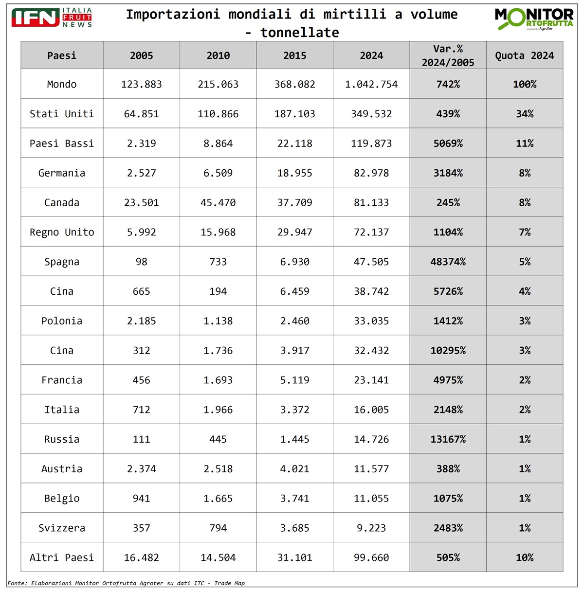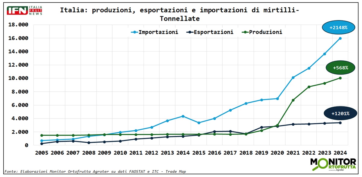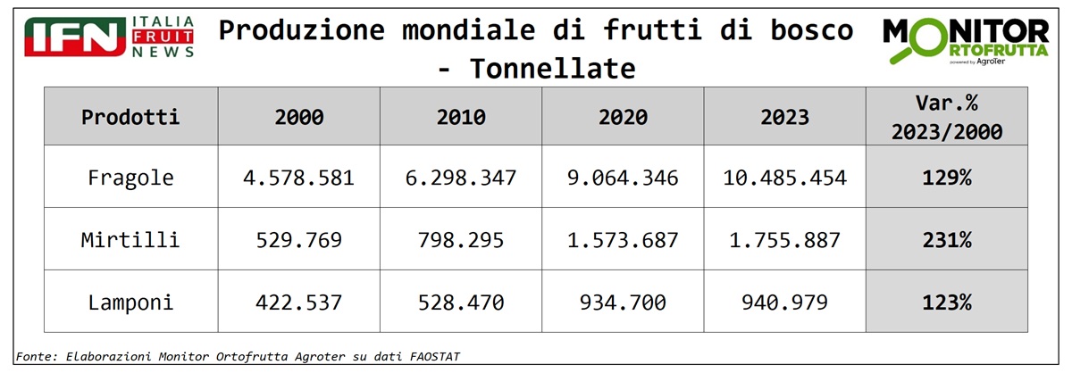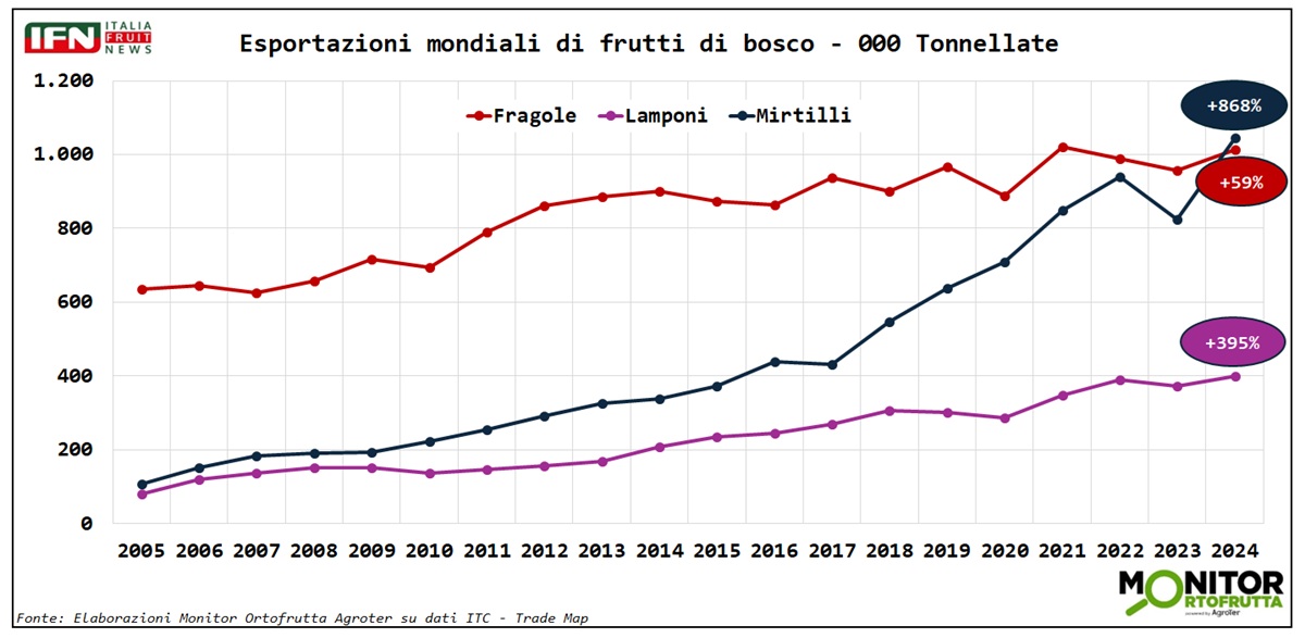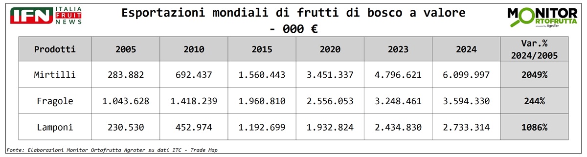 Esportazioni mondiali balzate da 108mila a oltre 600mila tonnellate in vent’anni, con un valore che supera quello combinato di fragole e lamponi