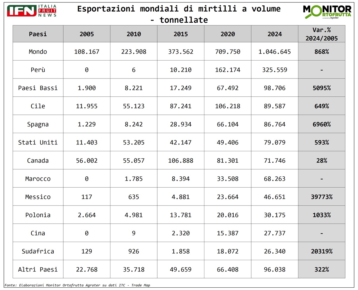 Questa crescita nelle esportazioni è legata anche all’ingresso di nuove origini produttive, come mostra la tabella dei principali Paesi esportatori. Vent’anni fa Stati Uniti e Canada rappresentavano il 63% del commercio mondiale, con scambi quasi esclusivamente bilaterali: gli USA rifornivano il mercato canadese per buona parte dell’anno e il Canada completava l’offerta statunitense da agosto a novembre. Nell’emisfero sud, Cile e Sudafrica erano già presenti ma hanno registrato un’espansione significativa. Ancora più dirompente è stato l’ingresso del Perù, che in appena dieci anni è diventato leader mondiale, con esportazioni destinate quasi interamente ai mercati dell’emisfero nord.