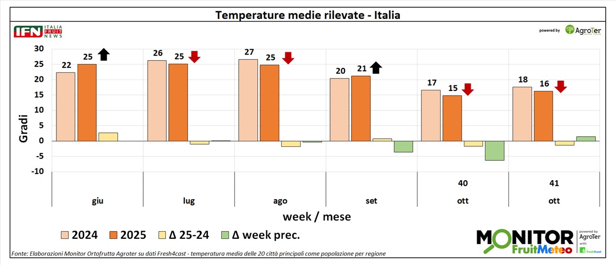 Le analisi del Monitor Ortofrutta si arricchiscono grazie a una nuova collaborazione dedicata a esplorare settimanalmente una variabile spesso decisiva per il settore ortofrutticolo: il meteo. Tra i diversi fattori che influenzano le condizioni climatiche, questa nuova rubrica si concentra in particolare sulle temperature medie registrate lungo la Penisola, con il supporto di Fresh4cast, una piattaforma software in cloud specializzata nella previsione della domanda e nell'ottimizzazione della supply chain per il settore ortofrutticolo.
