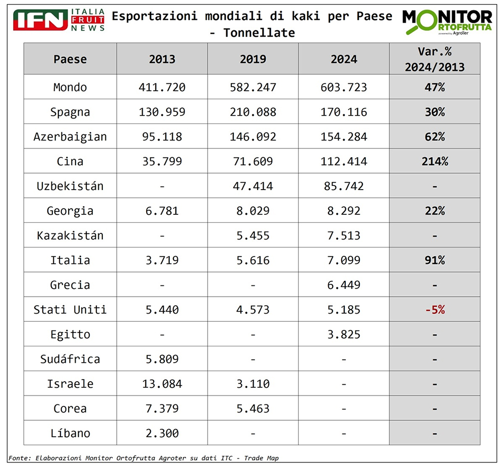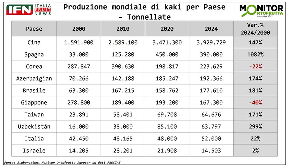La Cina rappresenta circa il 70% della produzione mondiale e mantiene saldamente la leadership. Corea e Giappone sono gli unici Paesi che mostrano un calo nel periodo considerato. Israele è cresciuto tornando sui livelli iniziali, l’Italia è rimasta stabile attorno alle 50mila tonnellate, mentre aumenti significativi si registrano in Spagna, Azerbaigian, Brasile, Taiwan e Uzbekistan. Nel caso spagnolo, la crescita è legata essenzialmente alla varietà locale Rojo Brillante e all’adozione di tecnologie per la rimozione dell’astringenza, oltre che all’impiego di diversi gas conservanti.