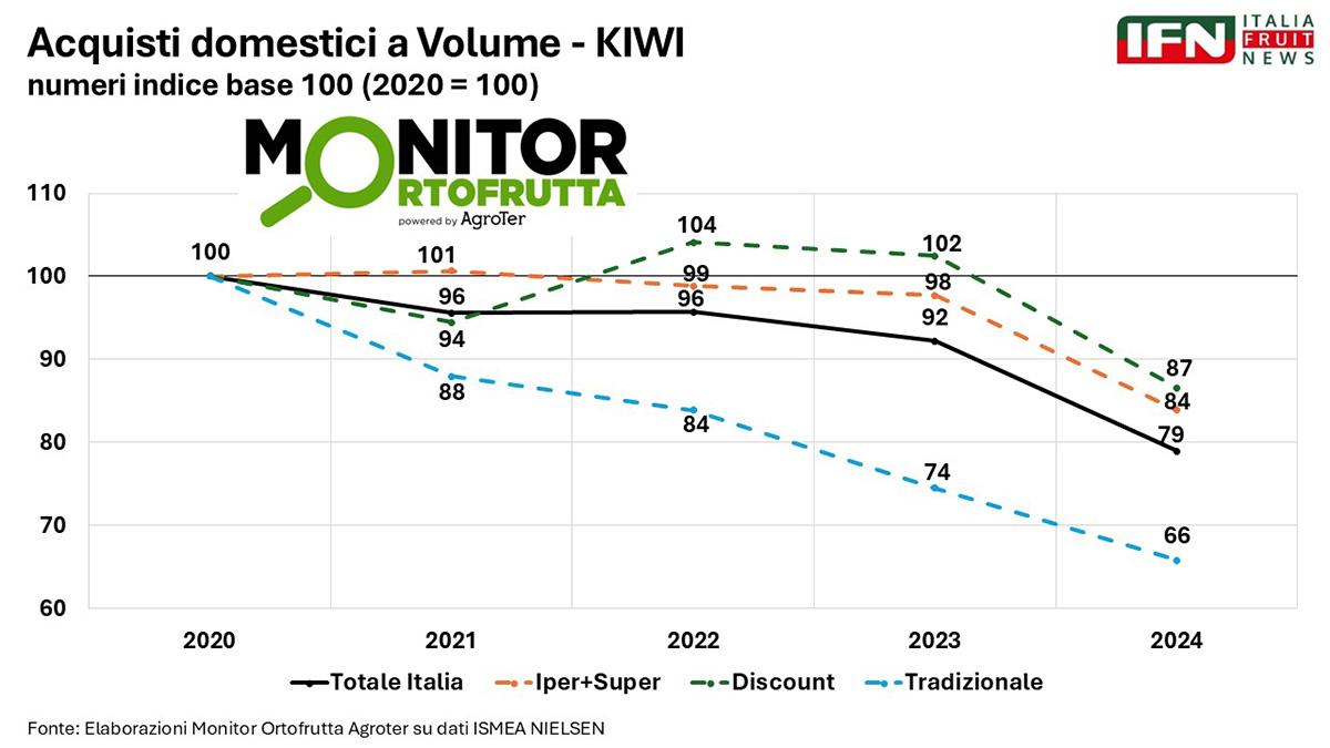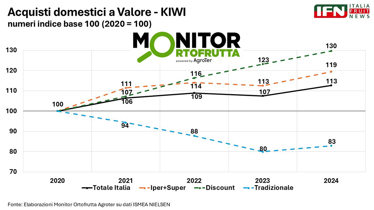 Tuttavia, non c’è da preoccuparsi: a valore il comparto tiene, con una crescita media del 13% su tutti i canali nello stesso periodo, trainata in particolare dal discount (+30%) e da iper e supermercati (+20%). Un’ulteriore nota positiva arriva dal monitoraggio del prodotto confezionato, che conferma il trend di crescita del kiwi giallo, pur lasciando ancora al verde il ruolo di riferimento del mercato”.