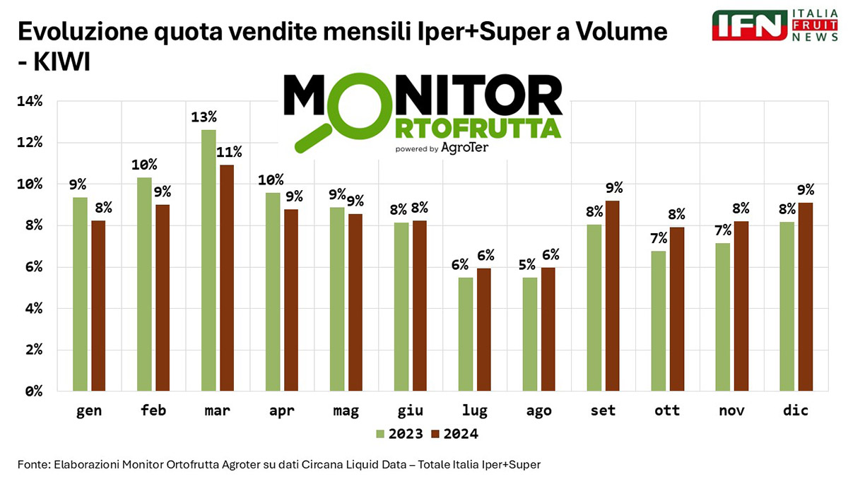 Detto ciò, l’Italia è destinata a diventare il principale Paese produttore di kiwi giallo dell’emisfero Nord, grazie alla progressiva entrata in produzione di nuovi impianti e all’avvio di ulteriori progetti. Si tratta di un segmento dinamico, organizzato e gestito in modo coordinato, che consente una pianificazione più efficace e un miglior controllo del mercato.