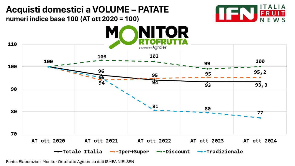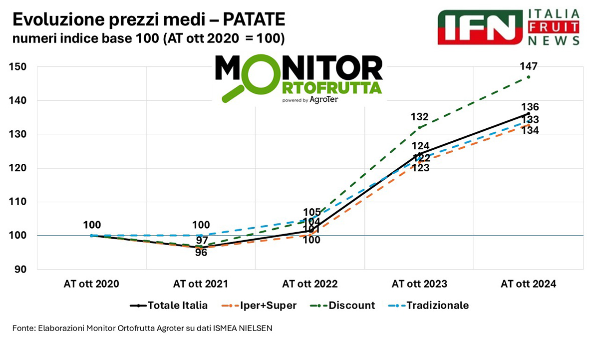La patata si conferma la regina dei consumi, soprattutto nella Gdo, con il discount in prima linea, dove, nonostante un aumento dei prezzi di quasi 40 punti percentuali negli ultimi due anni, i consumi sono rimasti pressoché stabili. Questo incremento delle quotazioni al consumo ha portato benefici anche ai produttori, che, dopo diverse annate difficili, hanno finalmente visto riconosciuti i propri sforzi.