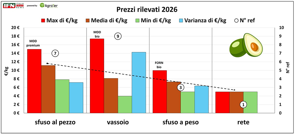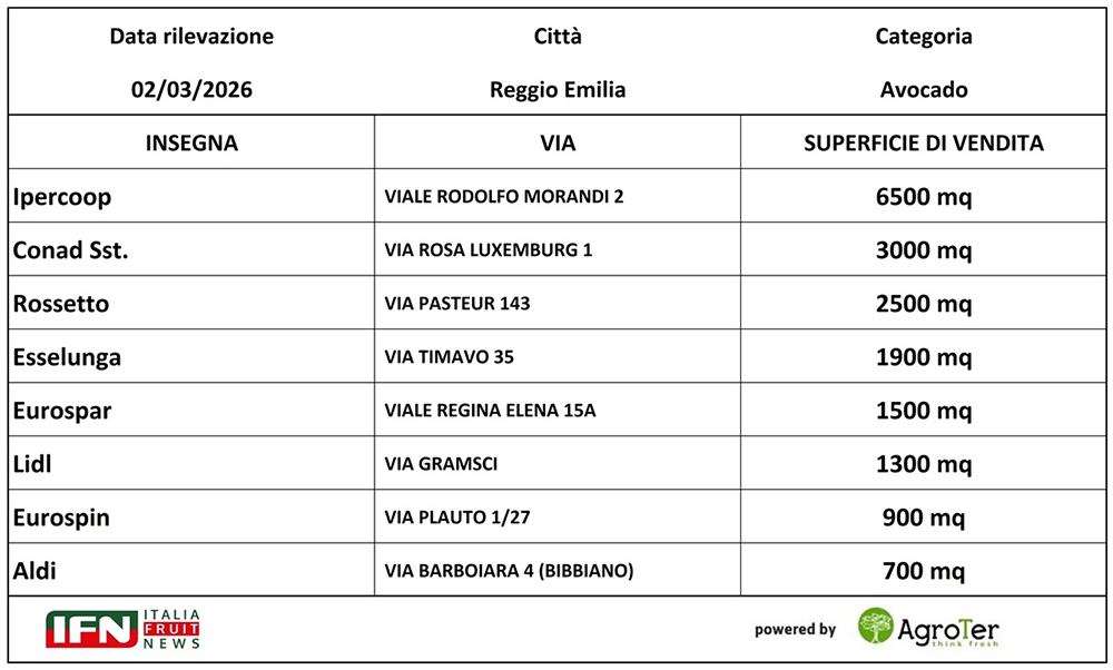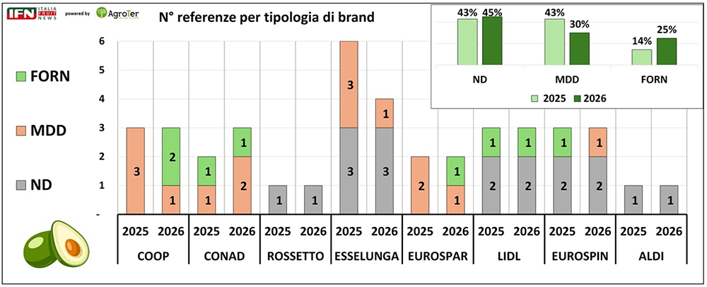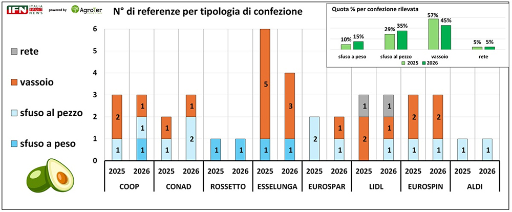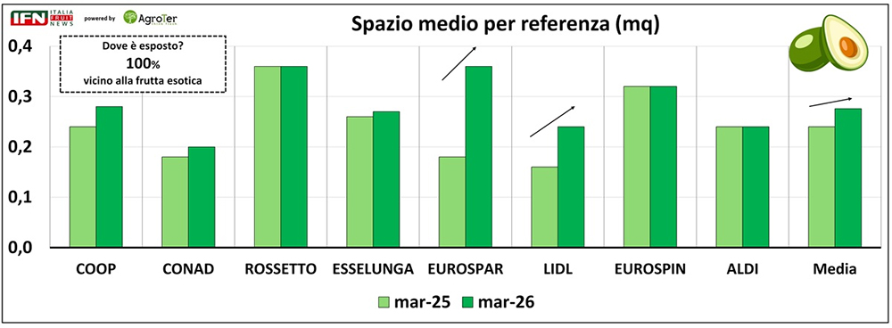 Una nota riguarda invece l’area del reparto in cui è collocata la categoria. Sia nel 2025 sia nel 2026 tutte le referenze rilevate erano posizionate all’interno della frutta esotica o, al limite, nel comparto della frutta in generale. Nessun negozio ha scelto di inserire gli avocado nel reparto verdura, ad esempio accanto a pomodori o insalate, per creare un collegamento immediato con le modalità di consumo del prodotto. Proprio qui potrebbe esserci un’ulteriore opportunità di sviluppo.