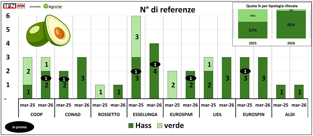 Emblematico il caso di Rossetto ed Eurospar che, nel 2025, proponevano esclusivamente avocado verde e sono passati interamente all’Hass. Anche Esselunga ha rivisto l’assortimento eliminando il verde e aumentando le referenze di Hass. Nel complesso, tutte le scelte assortimentali rilevate sembrano orientate a valorizzare questa varietà.