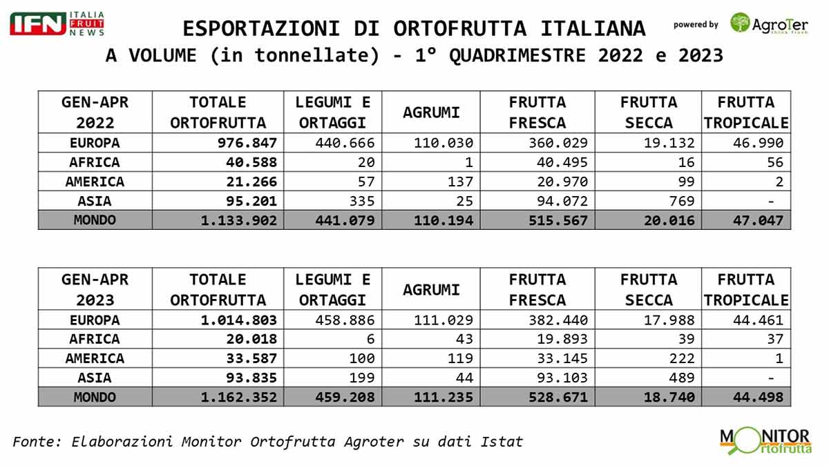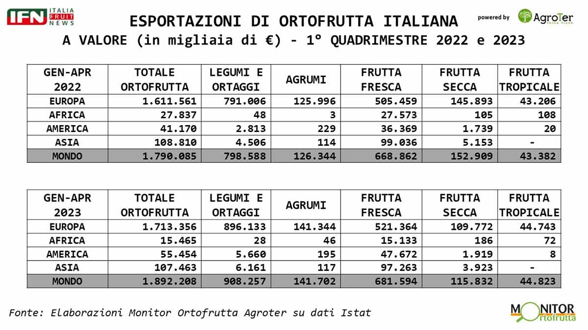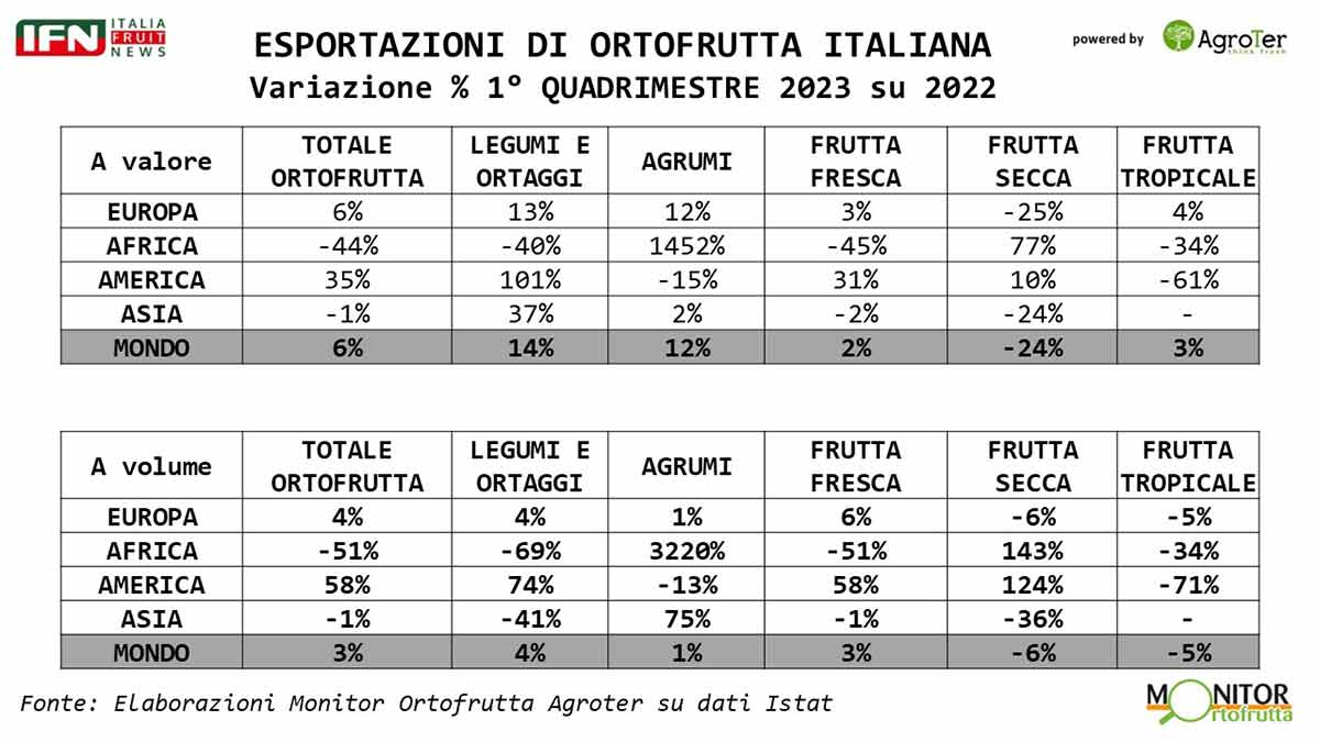 Nel primo quadrimestre 2023 l’Europa si riconferma il mercato di riferimento per le esportazioni ortofrutticole italiane, detenendo da solo oltre il 90% del totale. Rispetto all’anno scorso, tuttavia, si nota una crescita sostanziosa (+35% a valore + 58% a volume) delle vendite in America, mentre il mercato asiatico, secondo per importanza, è in leggero calo (-1% sia a valore che a volume). Sono queste le principali evidenze che emergono dall’analisi del Monitor Ortofrutta di Agroter su dati Istat, in relazione ai mercati principali per l’export ortofrutticolo italiano.
